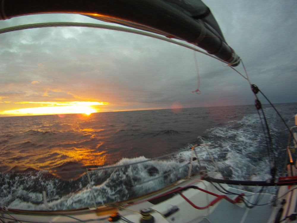 La dépression s’éloigne vers l’est, le vent monte à 55 nœuds mais ne devrait pas empirer. Dès que l’on relâche les écoutes et qu’on sort de la cape, le bateau file, même sous une petite surface de toile. On tient bon toute la nuit. Au matin, le ciel se déchire, des éclats de bleu percent la couverture métallique. Le soleil effleure l’horizon, première lumière directe depuis des jours. Le vent hurle toujours, mais le moral remonte.