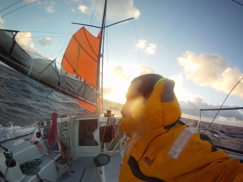 La navigation s’est adoucie, le grand gennaker nous propulse sur de belles vagues. Une zone de vents faibles va bientôt nous rattraper et ralentir notre progression. Rien d’alarmant, sauf la température en chute libre. Le froid s’est installé, l’humidité s’infiltre partout, et l’eau de mer affiche tout juste 6 degrés. Toujours en deuxième position, mais la météo semble nous offrir une chance de rattraper le Cessna, le bateau de tête.