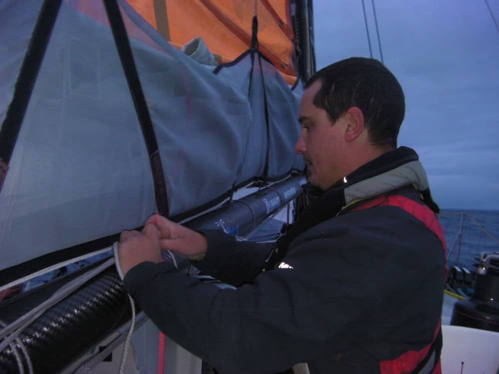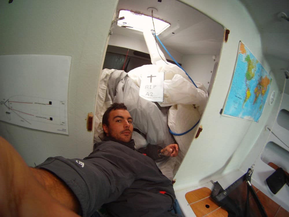 Notre débat est interrompu par le pilote automatique, qui décide de faire des siennes. Sans prévenir, il envoie la barre à fond, le bateau part en empannage sauvage. Couchés par le vent, tout le poids du mauvais côté, la grand-voile frotte sur les patins et les vérifications. Avant même d’atteindre le cockpit, j’entends le gennaker se déchirer. Rien à faire, la déchirure est irréparable. On n’avait vraiment pas besoin de ça. On hisse le spinnaker moyen et on choisit la route la plus sud, déterminés à reprendre l’avantage.
