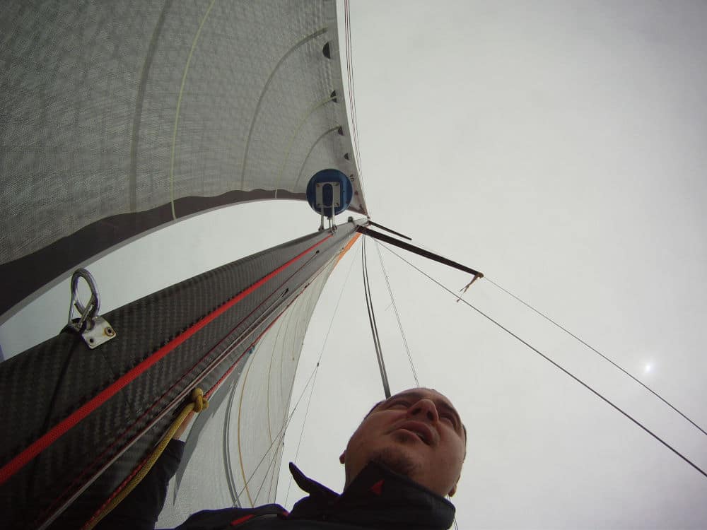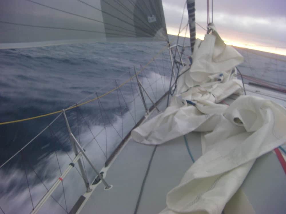 On prépare le bateau pour la tempête : foc de tempête gréé d’avance, quatrième ris pris sur la grand-voile, seule la têtière orange dépasse. Pour ralentir davantage, nous nous mettons à la cape. Le vent dépasse déjà les 40 nœuds, le ciel s’assombrit.