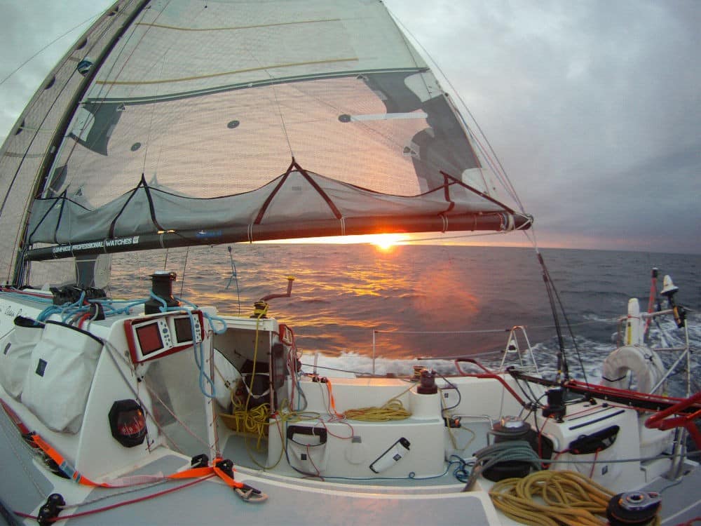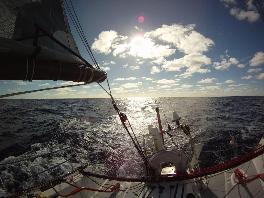 La crête de vents faibles nous atteint, mais peu à peu, on retrouve de la vitesse. Derrière la crête, la pression revient et les milles défilent à nouveau. Cessna semble piégé dans les vents mous. Il y a quelques jours, la mer était en furie, aujourd’hui, notre stratégie paie et la remontée s’accélère. Nous atteignons leur longitude, cinquante milles plus au sud, après avoir parcouru 300 milles de plus qu’eux. Le moral est au beau fixe.