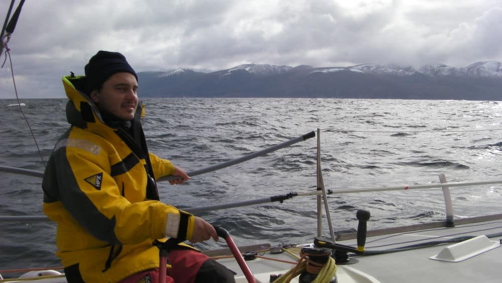 Enfin, un fragment de terre surgit : la Terre de Feu, ses montagnes abruptes, ses sommets blancs. L’émotion revient, vingt-sept jours depuis la Nouvelle-Zélande, et le premier aperçu argentin rend tout plus concret. Le tour du Cap Horn est accompli !