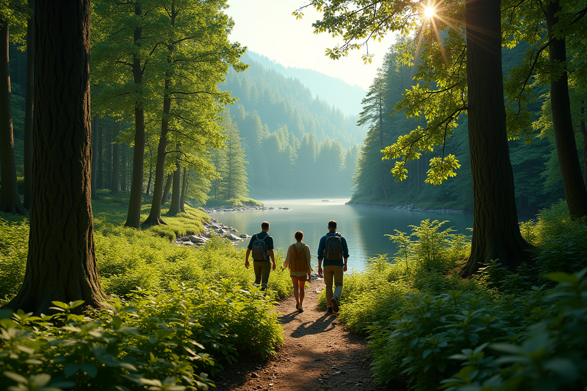 Randonneurs dans une forêt verdoyante avec rivière en arrière-plan