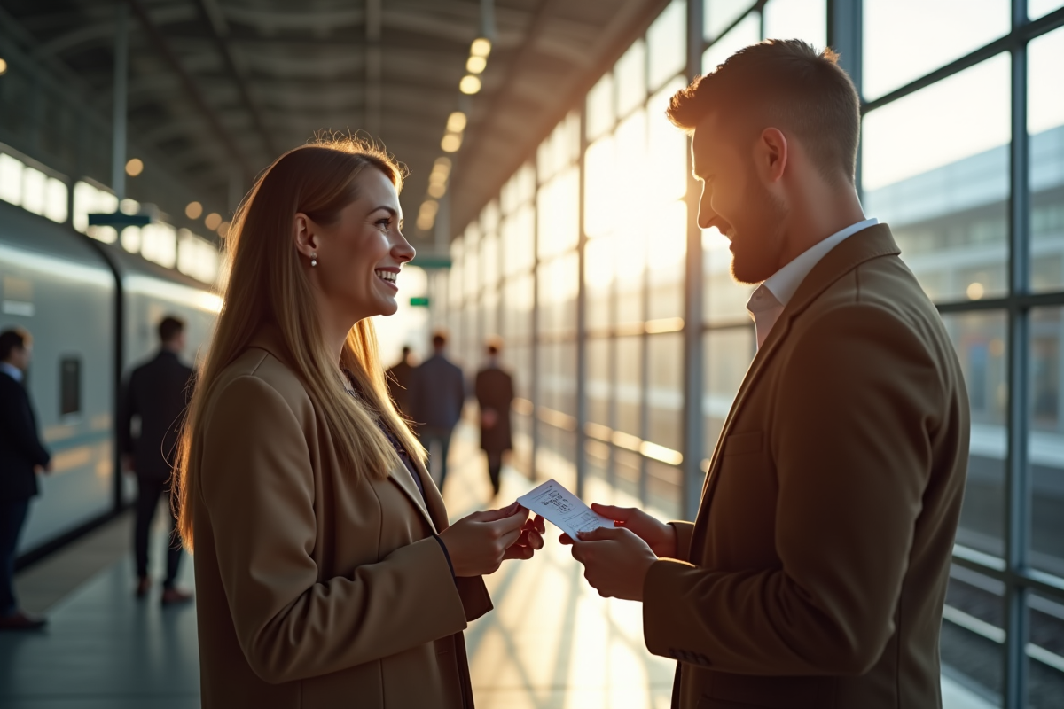 Deux personnes échangeant un billet dans une gare moderne en plein jour